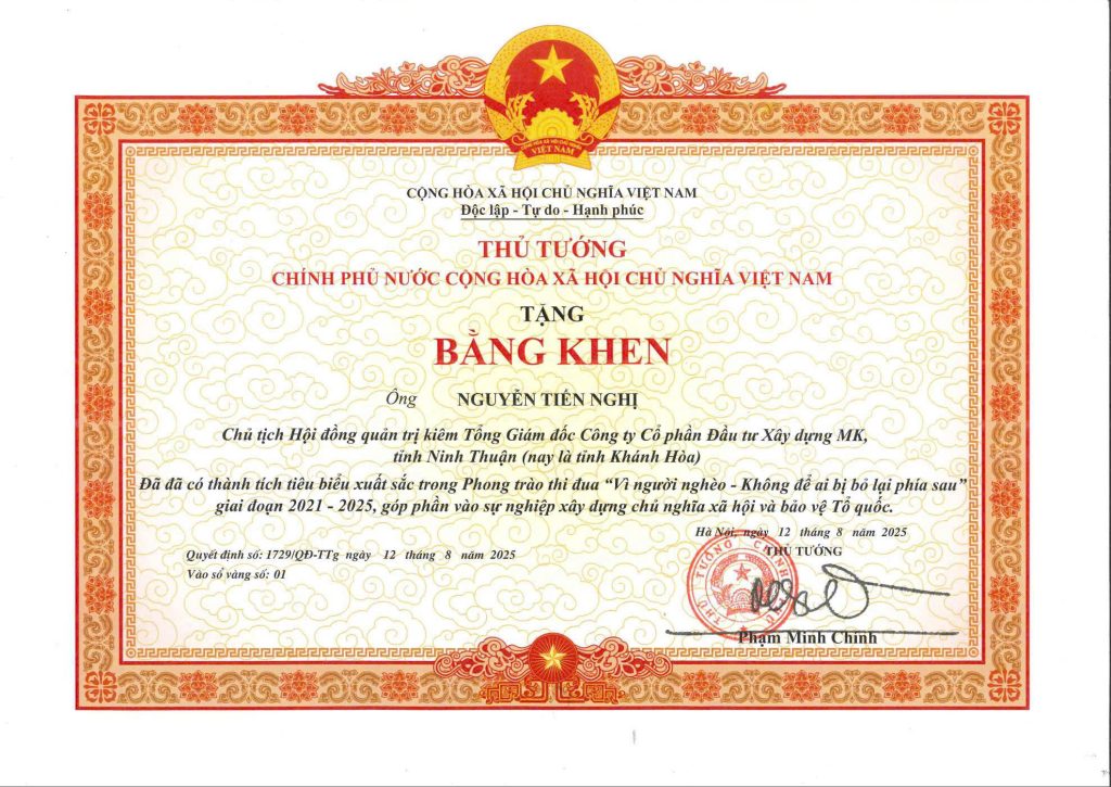 Phần vinh danh này không chỉ ghi nhận nỗ lực cá nhân mà còn khẳng định vị thế, uy tín và năng lực của Công ty Cổ phần Đầu tư Xây dựng MK, một doanh nghiệp tiên phong trong lĩnh vực đầu tư xây dựng, góp phần kiến tạo diện mạo đô thị hiện đại, văn minh cho tỉnh Khánh Hòa nói riêng và khu vực Nam Trung Bộ nói chung.